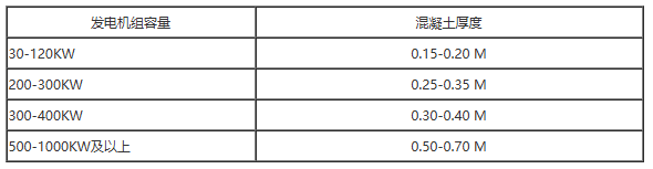 组装基本的好与坏,在发电机组的正常使用时会获得显著反应。用户在选择组装康明斯发电机基本时,要了解土层状况,土层至少得可以承受发电机队的长久有效净重及震动,所以在设计时应仔细斟酌。现阶段一般来说,混泥土厚度应符合下列规定就可以: