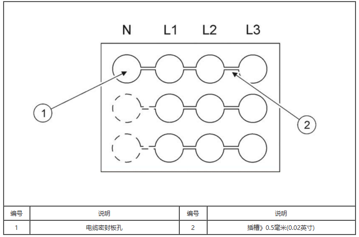 独芯负荷电缆线务必越过下图中所示的孔或电缆密封接头槽口。电缆密封板需要由非铁制材料制作。