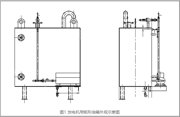 (1)如下图1所显示,方形机油箱是采用最为普遍的一种机油箱,它不仅有利于生产制造,又可充分利用空间,故一般(容积低于2000L)都采用这种方式,而且箱上易于安装柴油油箱加选元器件,因此被广泛采用。