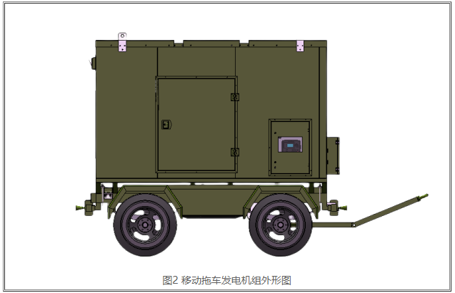 托车发电机组(发电厂)外观如下图2所显示。一般托车发电机组要在静音型发电机组的前提下配置了拖卡,完成了发电机队的智能便捷挪动,适用大城市范围之内短路线应急供电。